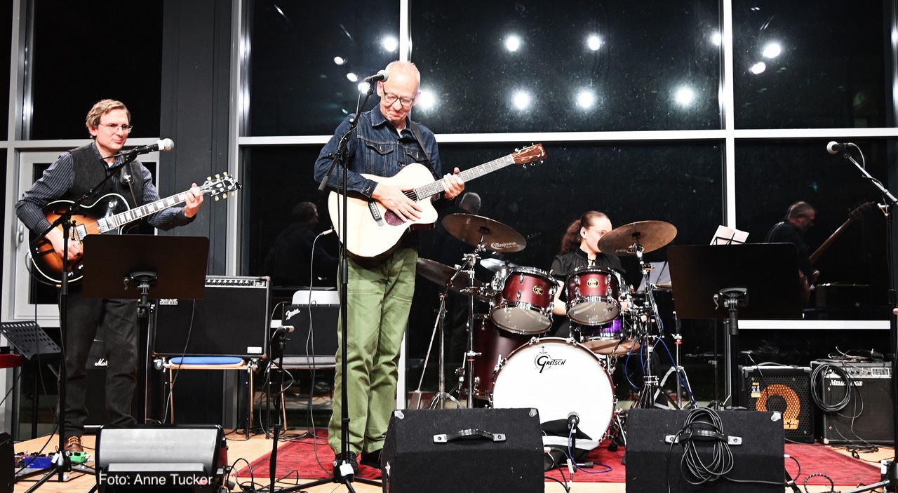 Die Kollegen*innen der E-Gitarre, die auch in diesem Jahr stark vertreten waren, bildeten den zweiten Teil des Konzertes. Da hörte das Publikum schon zahlreiche absolut professionelle Beiträge. Die Leitung und Moderation des Abends übernahm wieder Rolf Fahlenbock, der im Vorfeld auch zahlreiche Beiträge mit dem Schlagzeuger Mario Zielenbach einstudiert hatte. So gestalteten ständig wechselnde Besetzungen ein zwar langes, aber umso kurzweiligeres Konzert. Das Spektrum des Programms reichte diesmal von Werken des Ex-Shadows Gitarristen, Hank B. Marvin über den Blues- Giganten Gary Moore bis hin zu Swing oder Country Music, zu Soul, hartem Rock oder melancholischen Balladen. Dazu kamen auch zahlreiche Songs, die von Burt Bacharach, Melody Gardo, Stevie Wonder, Kaleo oder Leonard Cohen stammten und für die „richtige Mischung“ eines erfolgreichen Abschluss´ des Festivals sorgten.