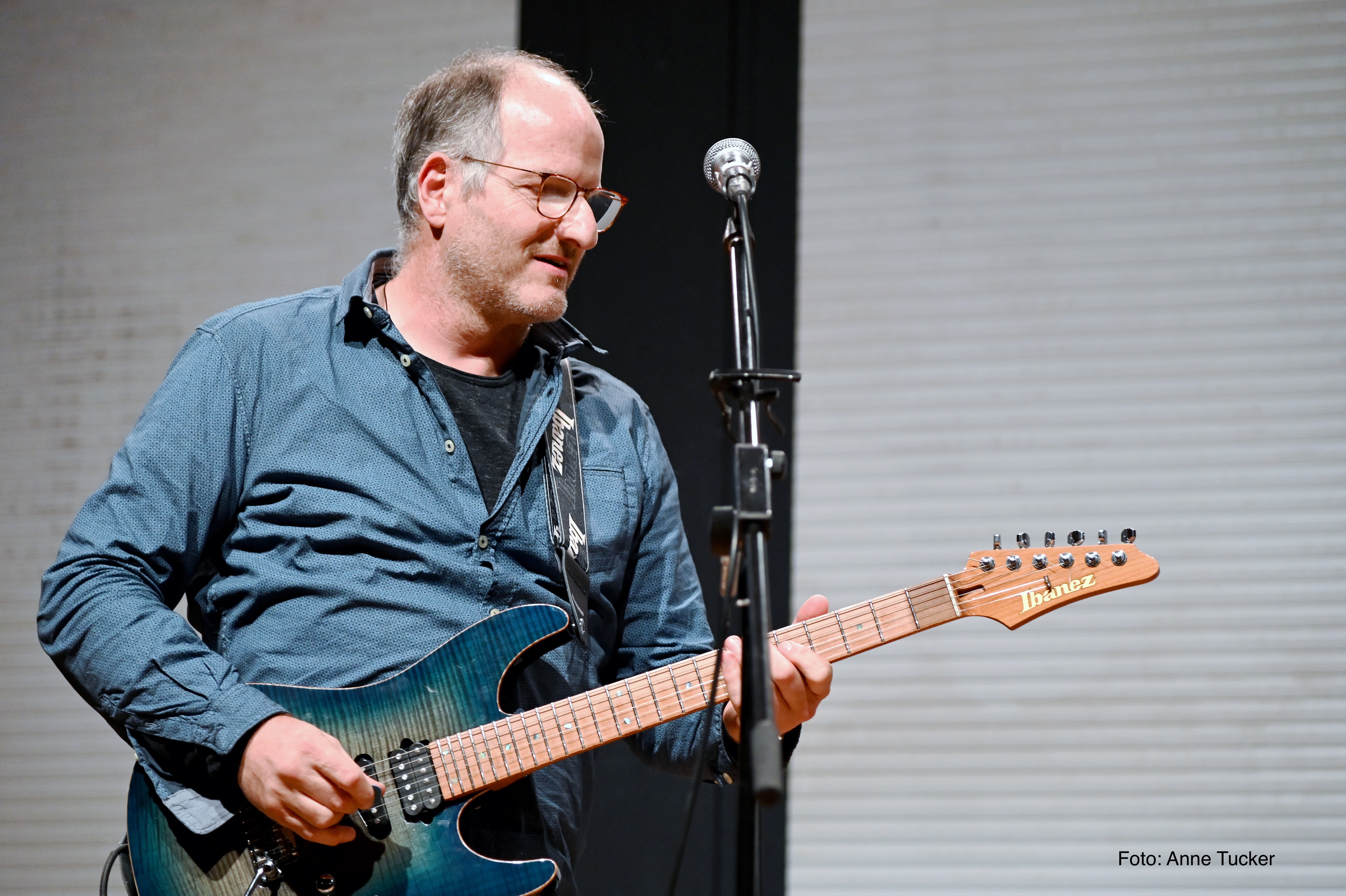 Philipp Humburg und Michael Borner, beide Stammdozenten des Festivals, bildeten dann zusammen mit einer Rhythmusgruppe (Bass und Latin-Percussion) den fulminanten Abschluss des Abends. Ihre Performance hatte ihren Schwerpunkt in der brasilianischen Musik bzw. im Latin-Pop. Beide zeigten einmal mehr, welch fantasievolle und kurzweilige Improvisationen sie spielen können, aber auch über welch große Vielfalt an Stücken sie verfügen, die sie mit dem entsprechenden Groove perfekt auf die Bühne bringen und so das Publikum, welches zum Schluss auch eingebunden wurde, zu lang anhaltendem Applaus bewegen.