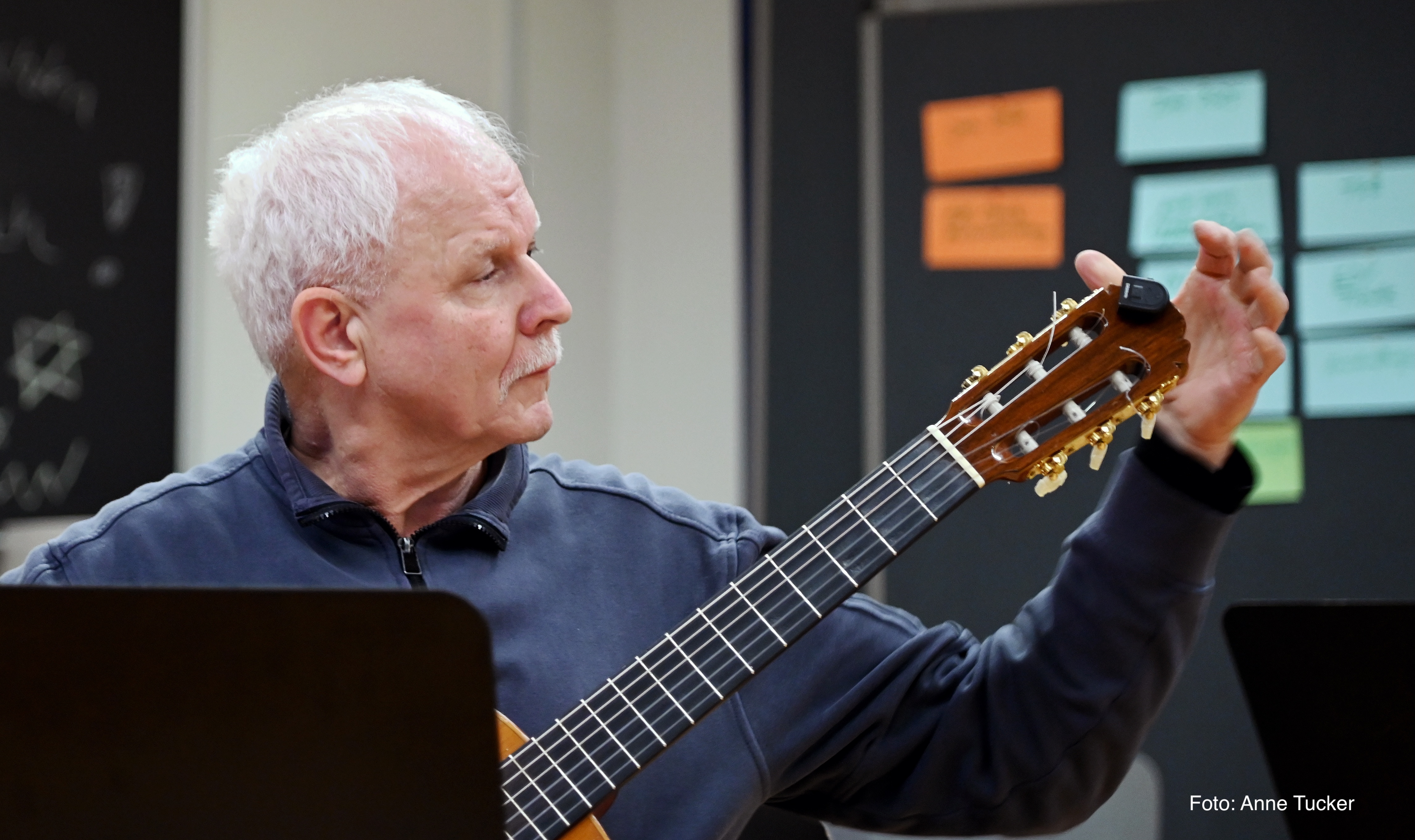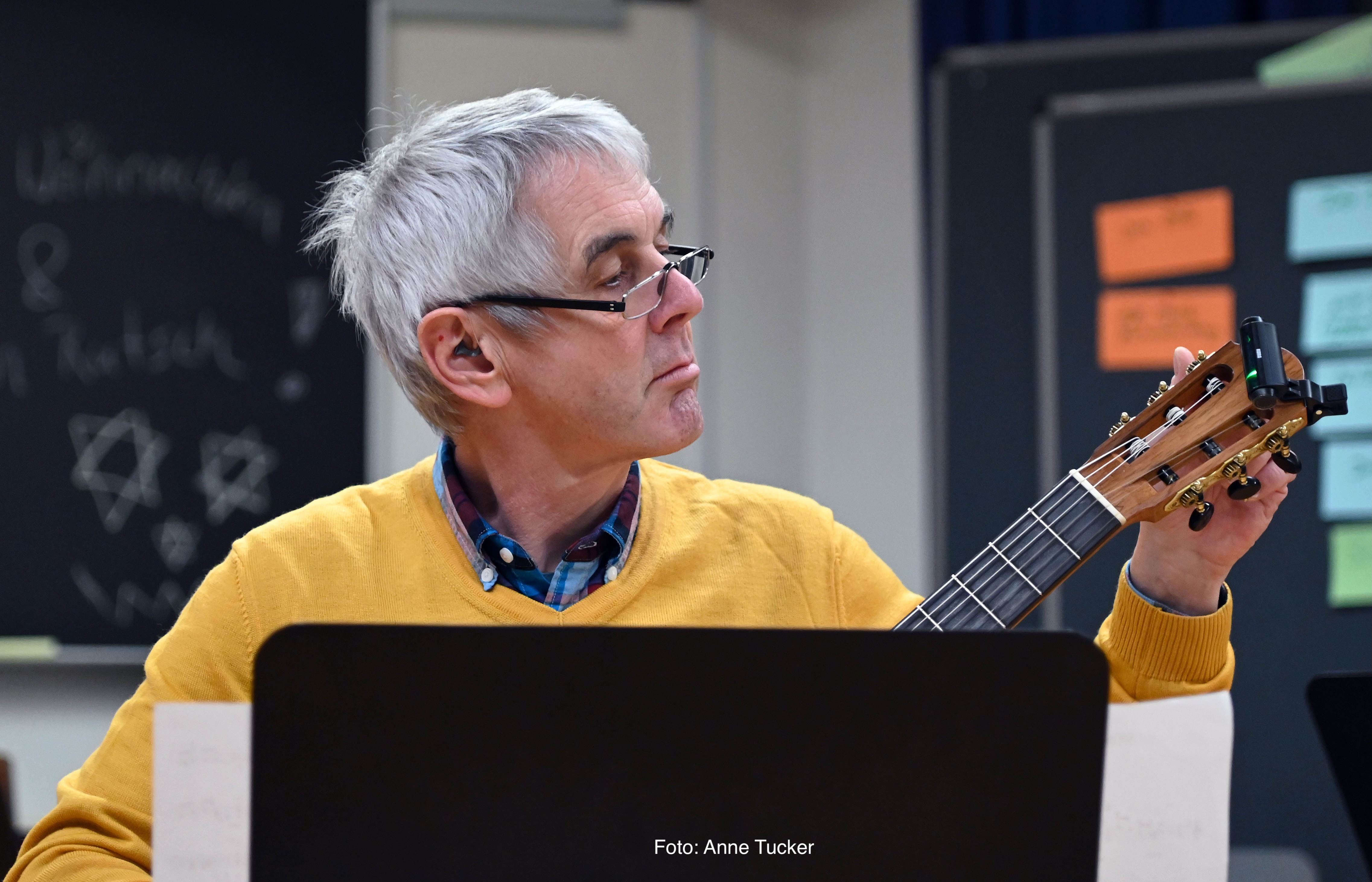 Rolf Fahlenbock gibt letzte Anweisungen zum Abschlusskonzert E-Gitarre