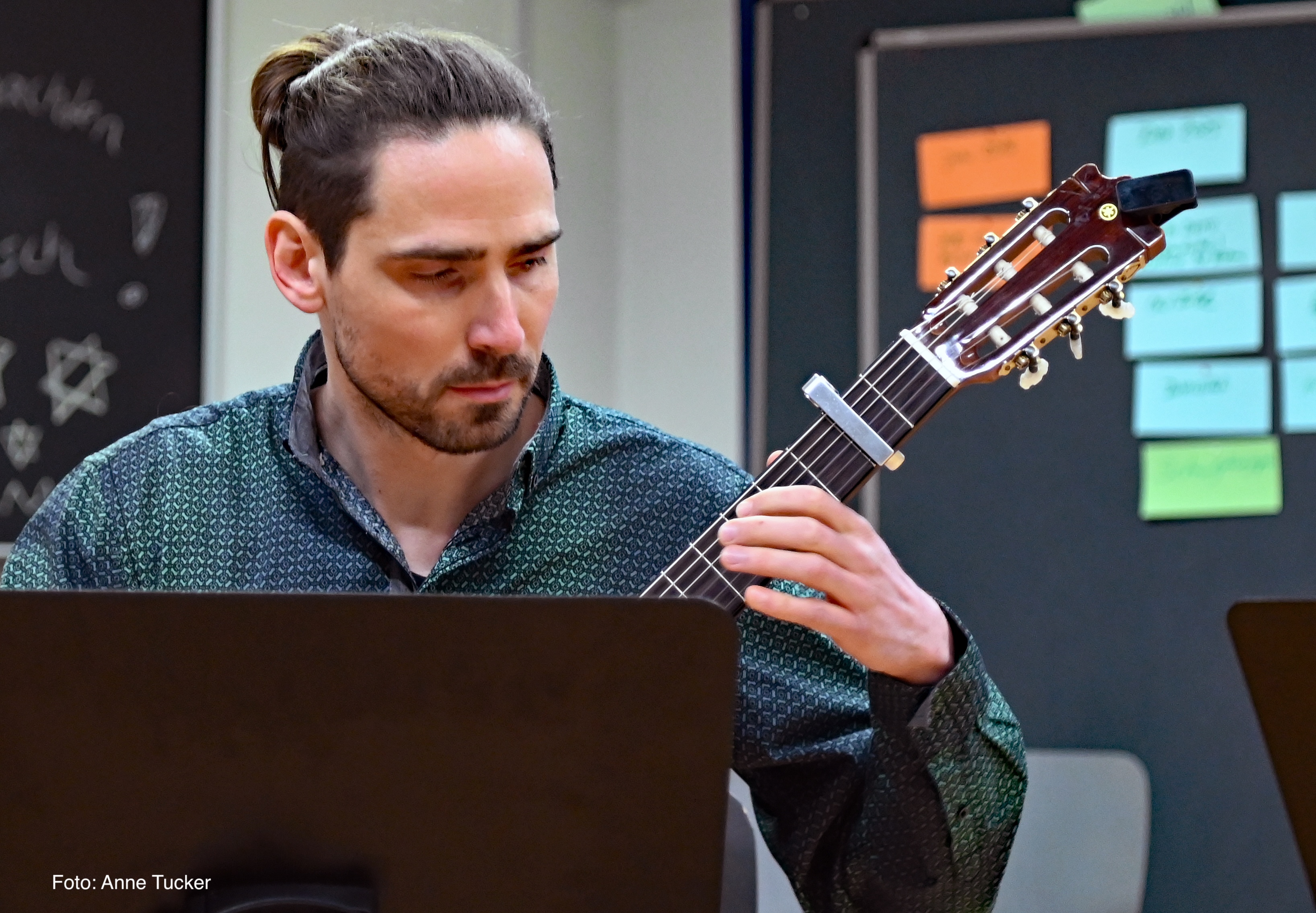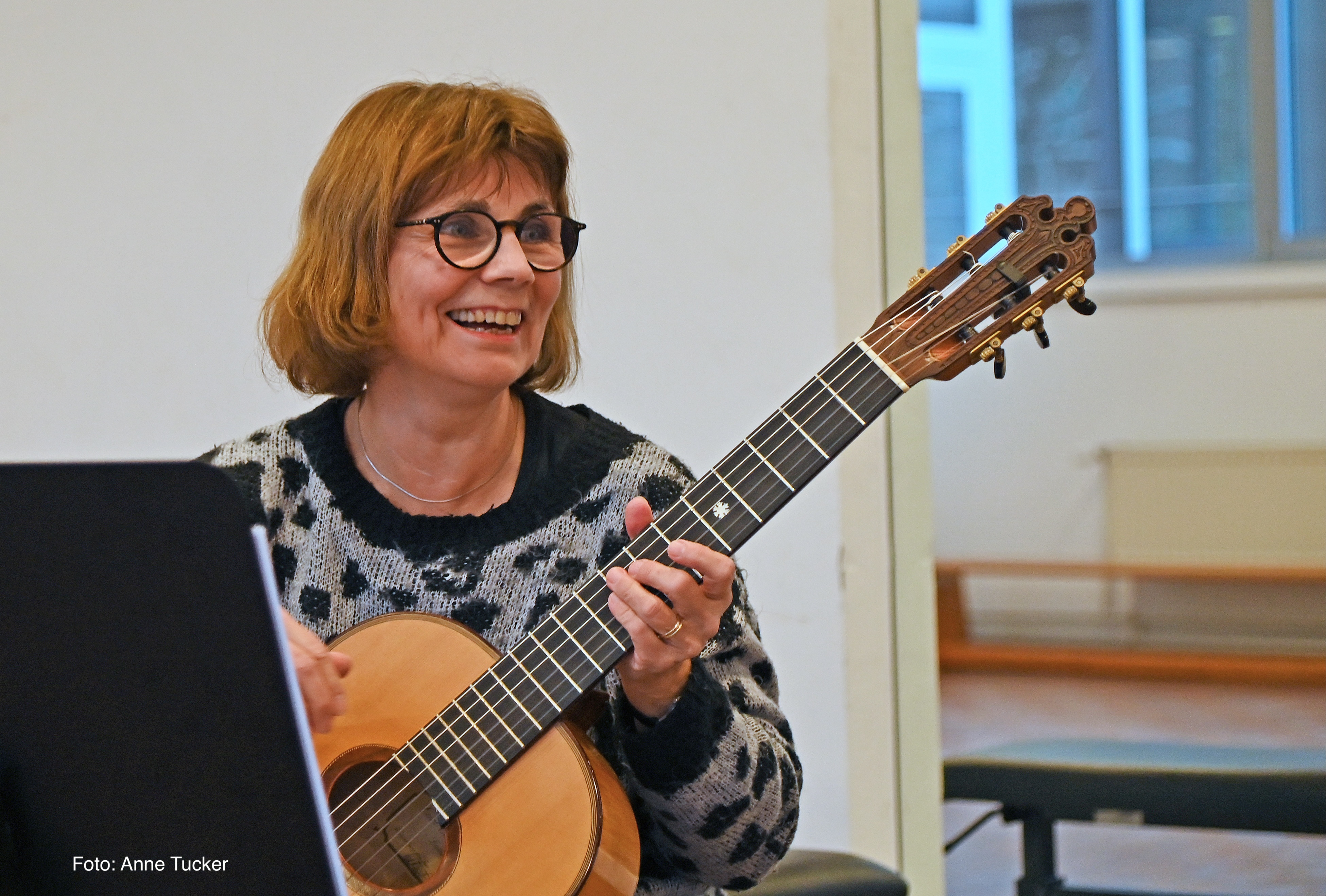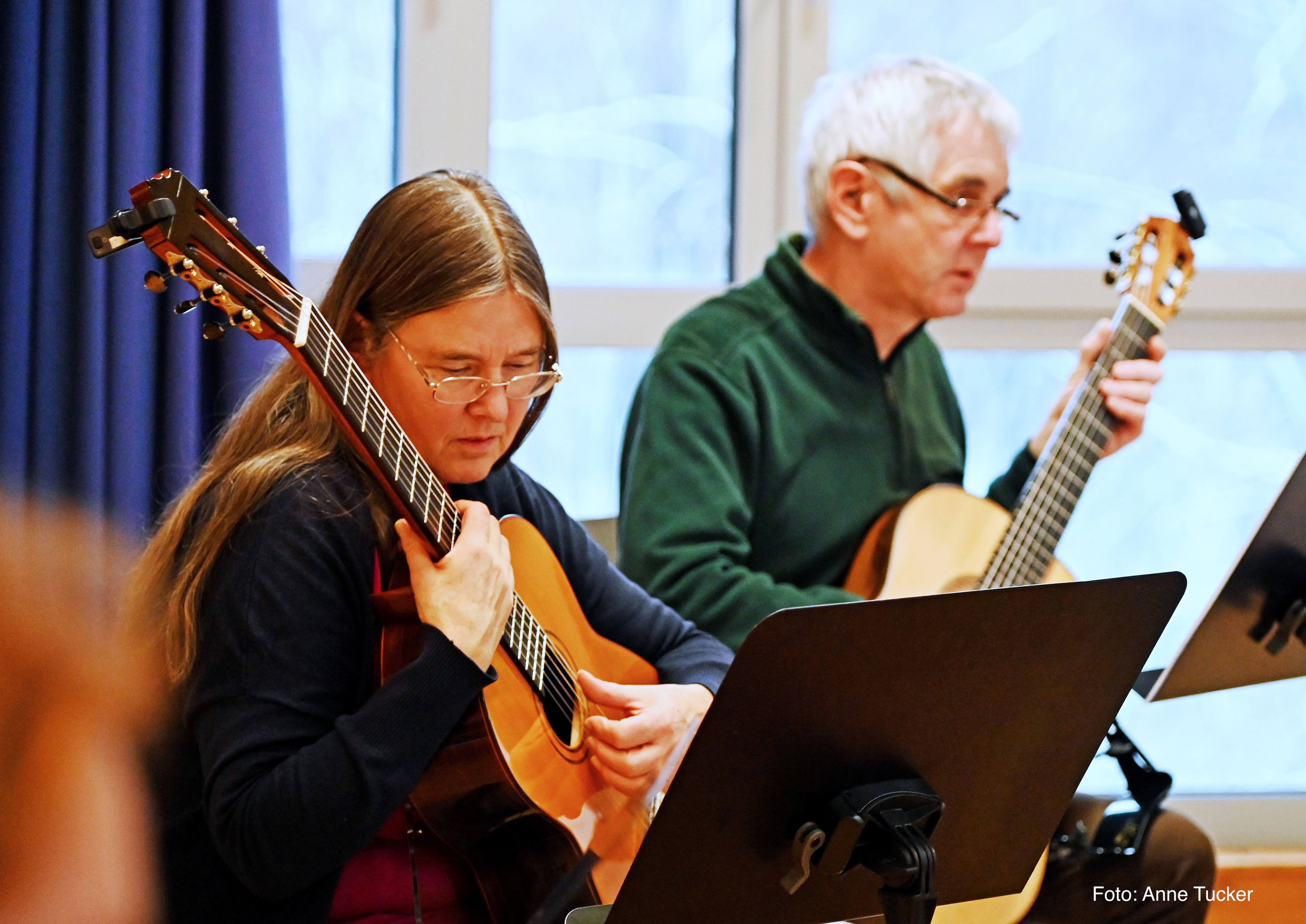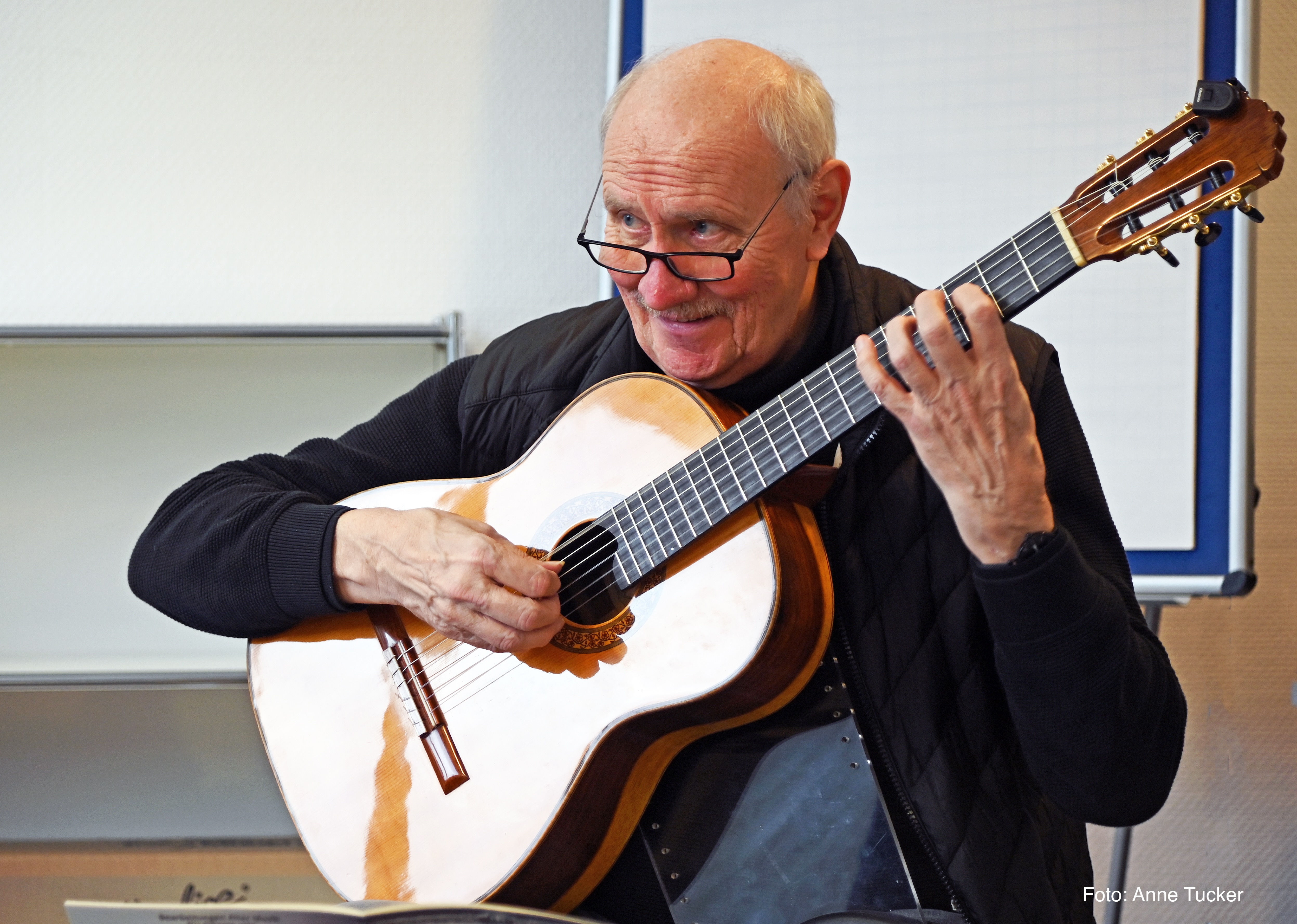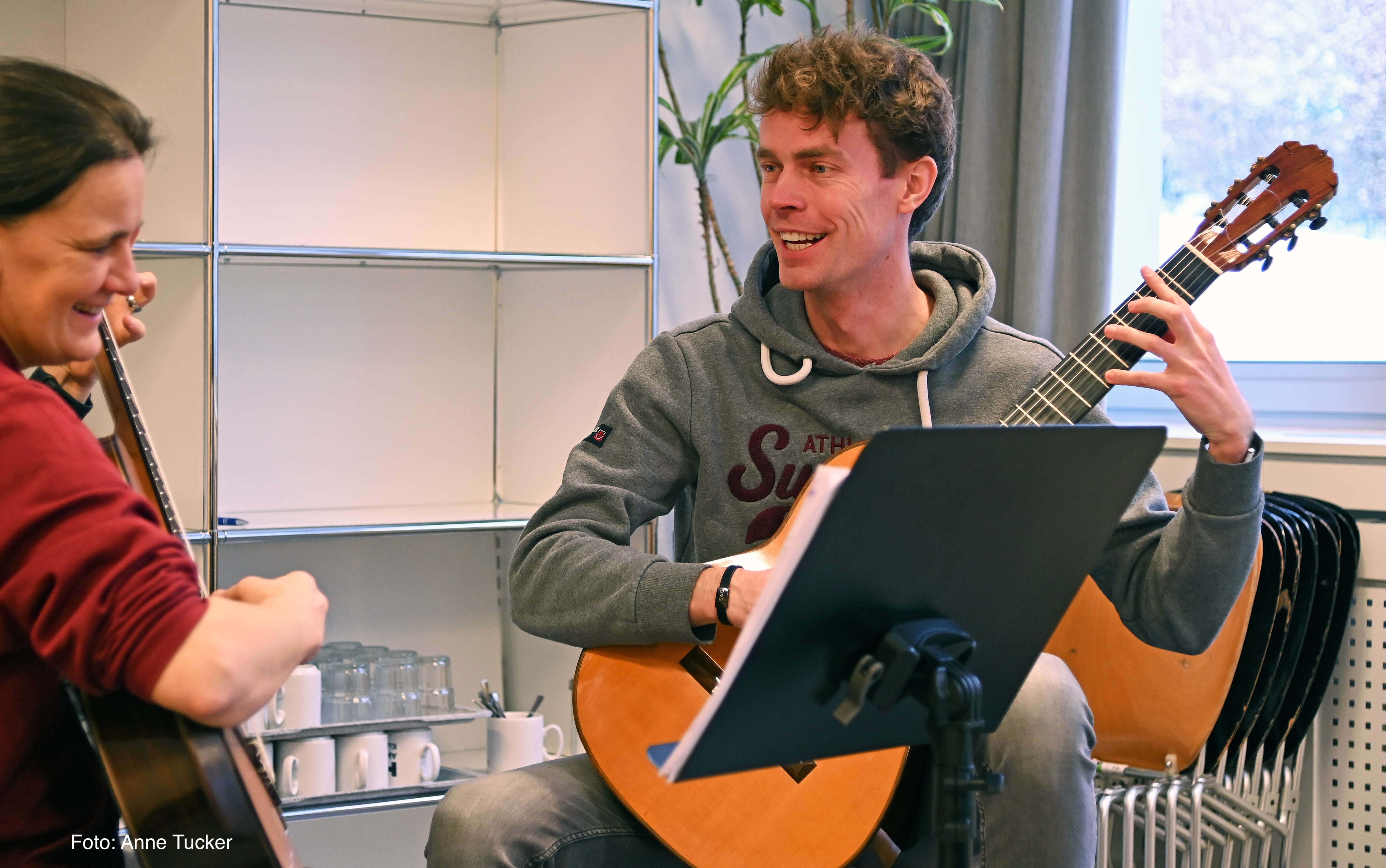 Die Angebotspalette des Festivals reicht ja von den Einzelunterrichten und Masterclasses, über Workshops, Vorträge und Seminare, Improvisatiotions- und Kompositionsangebote bis hin zu Kammermusik, Ensemblespiel und Bandarbeit. Dazu jeden Morgen für beide Instrumente, Rhythmus-Schulung und Technik Workshops. Darüber hinaus werden zu verschiedenen Themen wie Flamenco „Basics“ oder historisch-analytische Betrachtungen von Gitarrenwerken auch noch weitere Gastdozenten*innen eingeladen, wie in diesem Fall Bernd Steinmann und Joachim Geißler.