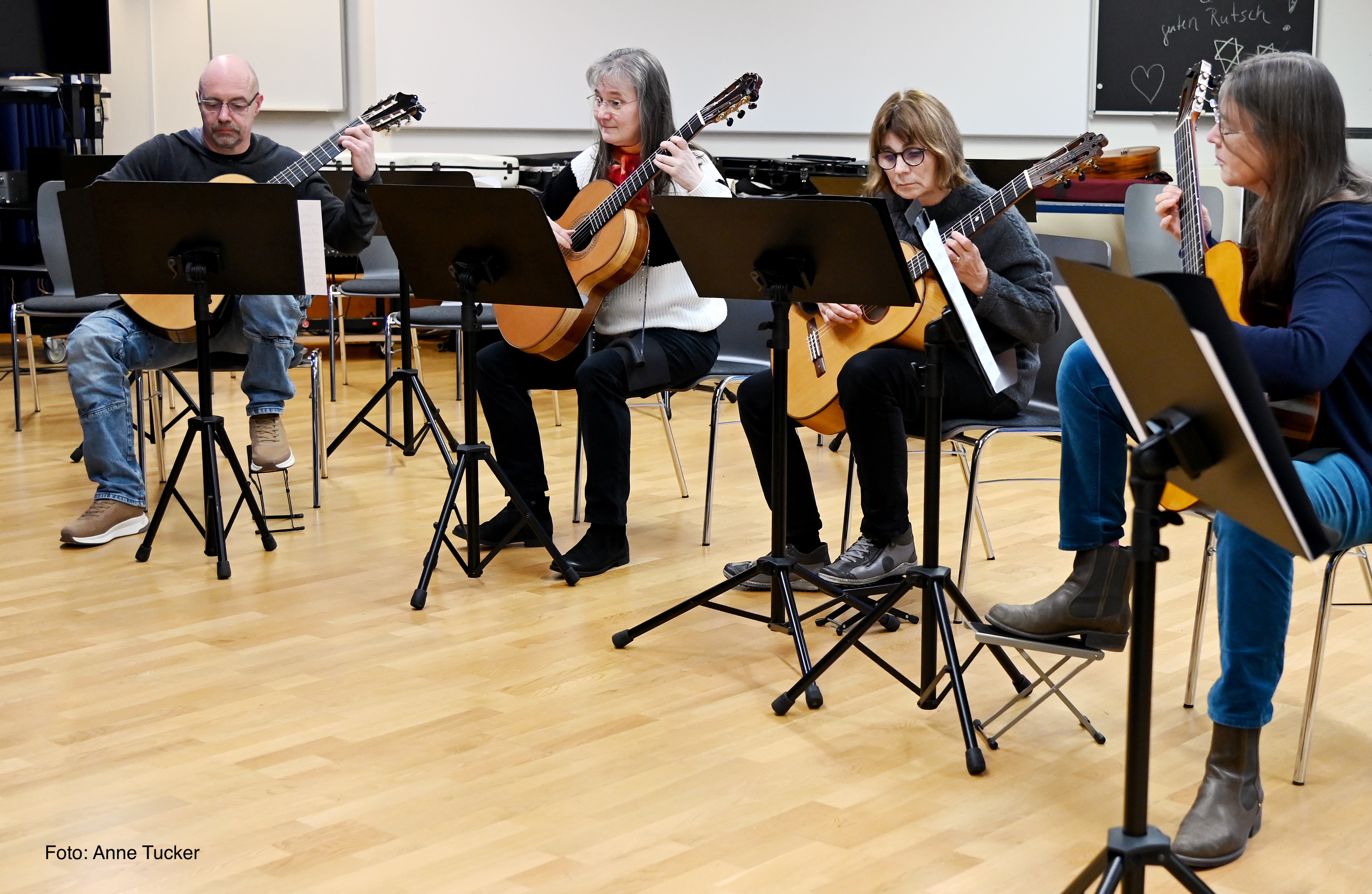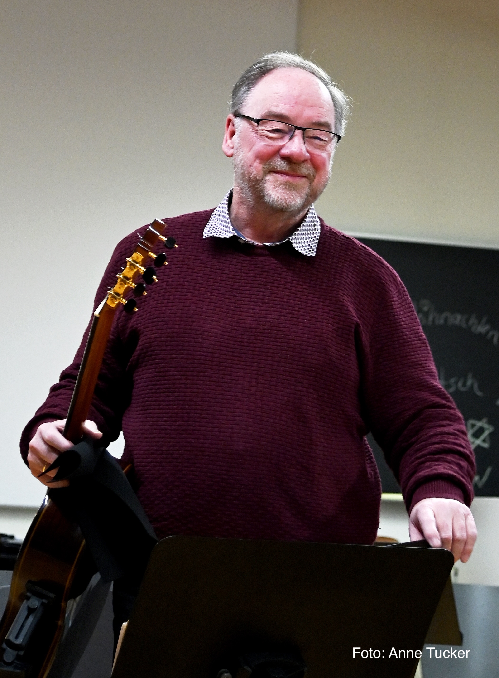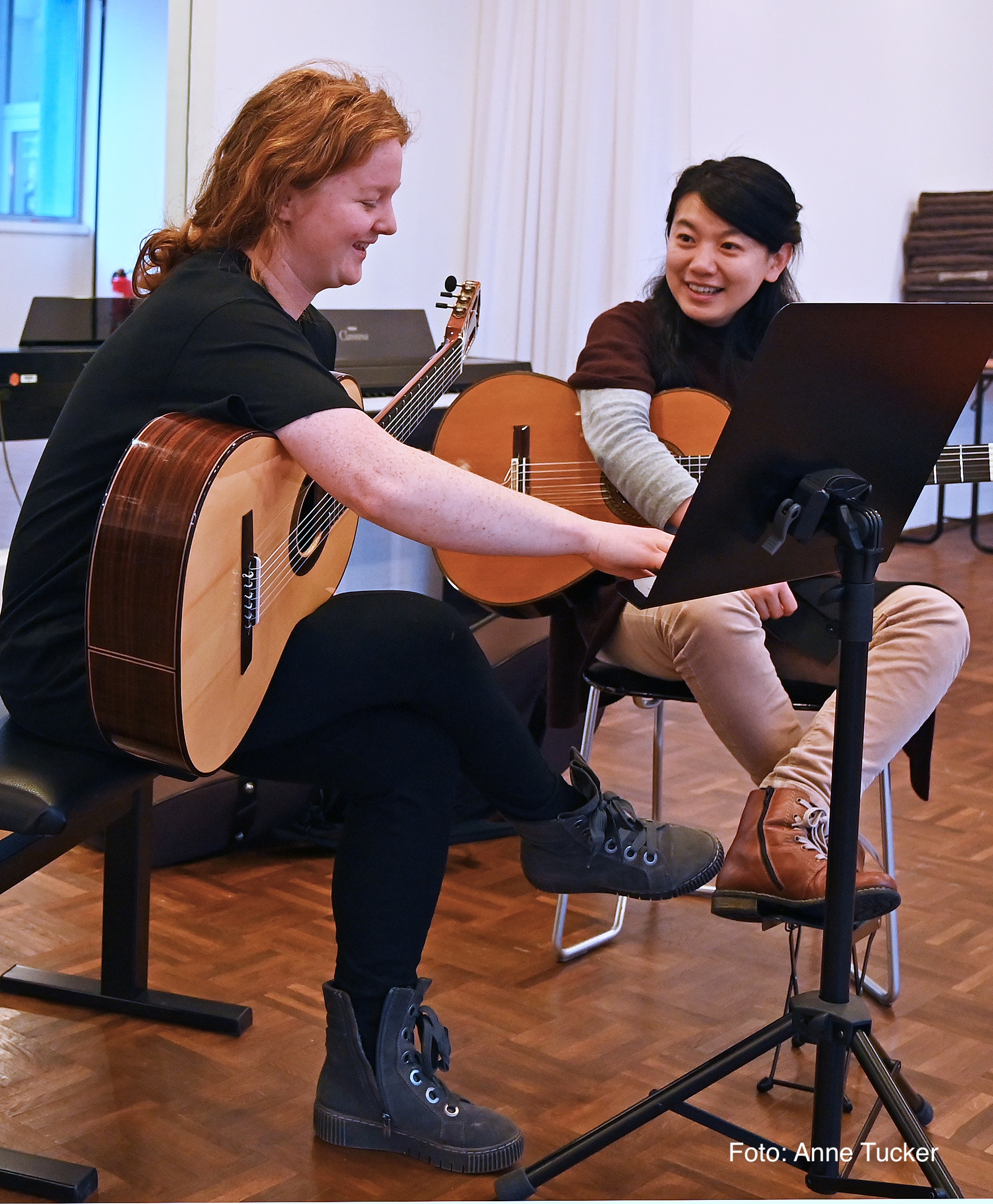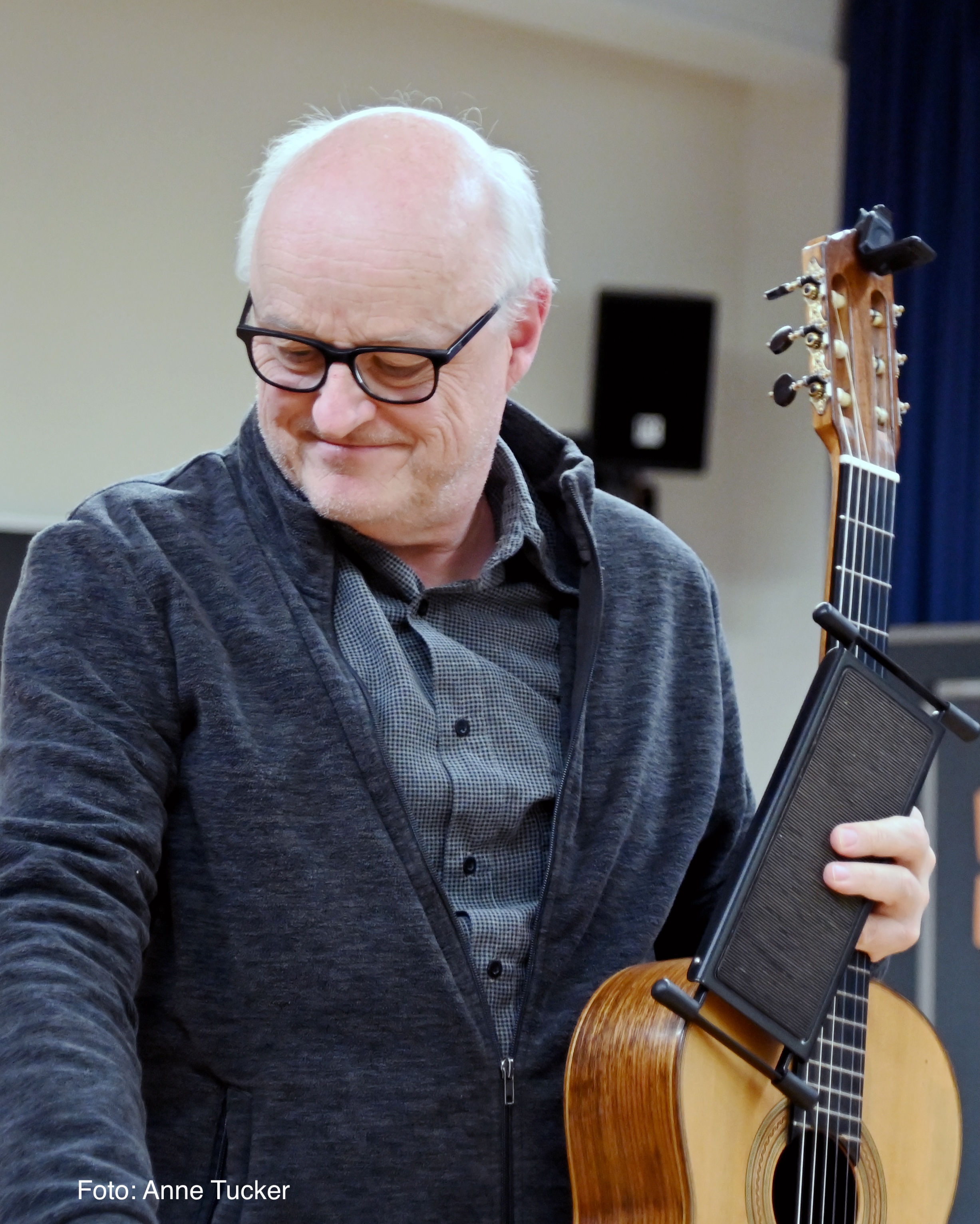 Die Angebotspalette des Festivals reicht ja von den Einzelunterrichten und Masterclasses, über Workshops, Vorträge und Seminare, Improvisatiotions- und Kompositionsangebote bis hin zu Kammermusik, Ensemblespiel und Bandarbeit. Dazu jeden Morgen für beide Instrumente, Rhythmus-Schulung und Technik Workshops. Darüber hinaus werden zu verschiedenen Themen wie Flamenco „Basics“ oder historisch-analytische Betrachtungen von Gitarrenwerken auch noch weitere Gastdozenten*innen eingeladen, wie in diesem Fall Bernd Steinmann und Joachim Geißler.
